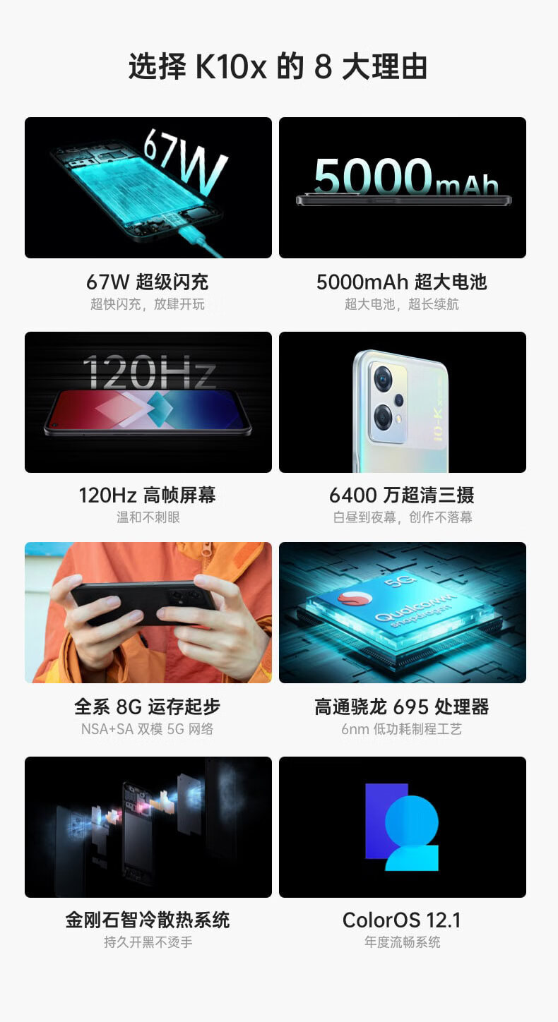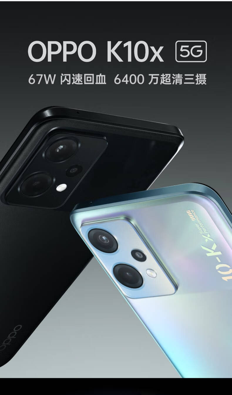 商品名稱:OPPO K10x 極光 8GB+256GB 67W超級閃充 5000mAh長續(xù)航 120Hz高幀屏 6400萬三攝 高通驍龍695 拍照 5G手機